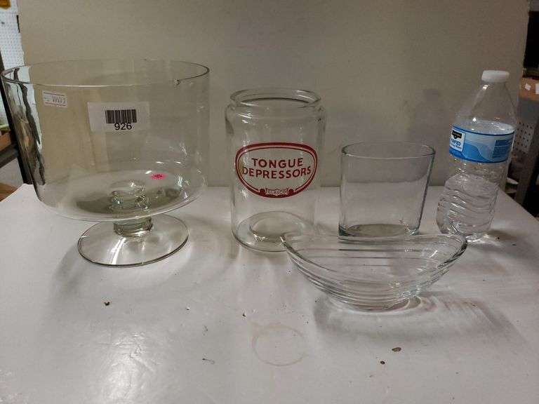 LOT 926 - Footed Glass Bowl. Vintage Tongue Depressions Jar, And Glass Bowl