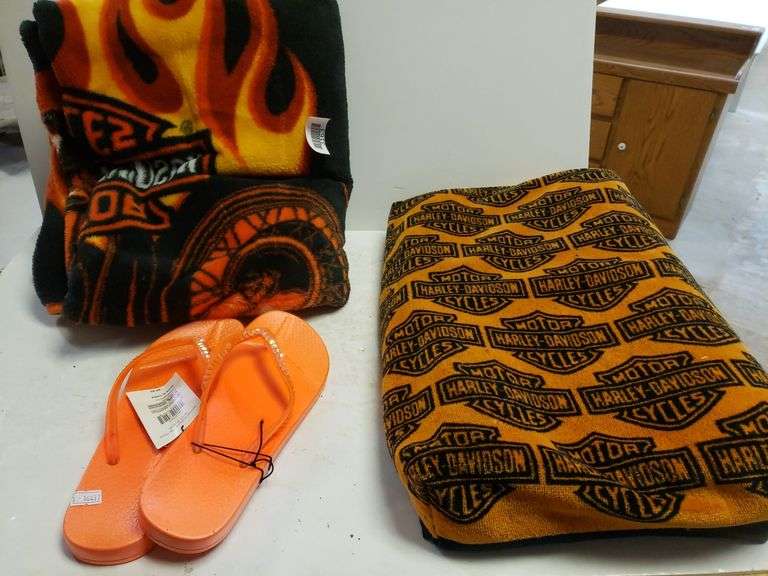 LOT 3163 - Harley Davidson Blanket, Cushion, Orange Flip Flops