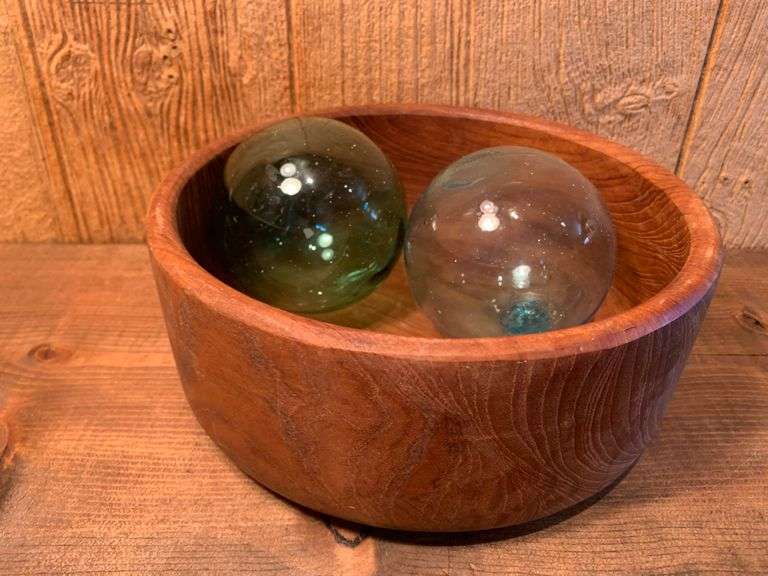 LOT 1211 - Quality Teakwood Bowl & Two Handblown Glass Balls
