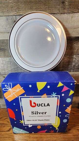 LOT 1158 - 10.25" Plastic Dinner Plates w/ Silver Trim. 50 still sealed, 36 unused in open package