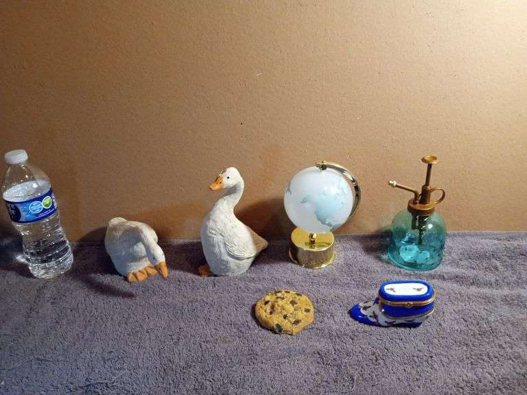 LOT 1033 - Set of Duck Figures, Plastic Globe, Blue Glass Mister, Shoe Trinket Box & Fake Chocolate Chip Cookie