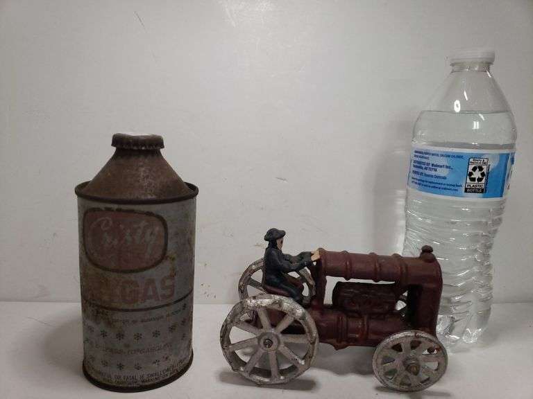 LOT 1112 - Vintage Christy Dry Gas Can (Has Stuff In It) & Vintage Metal Tractor