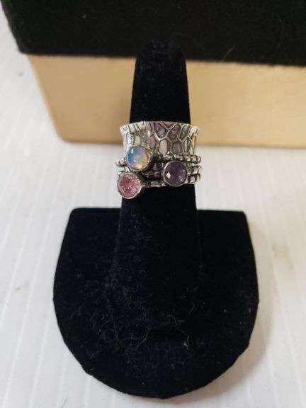 LOT 2083 - Quarter Sterling Silver Spinner Ring W/Colorful Gemstones- Size 6