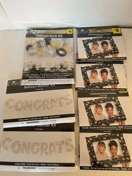 LOT 1130 - New! Party Decoration Lot: 1 balloon arch Kit, 2 blow up congrats kits, 4 blow up Photo Booth pictur