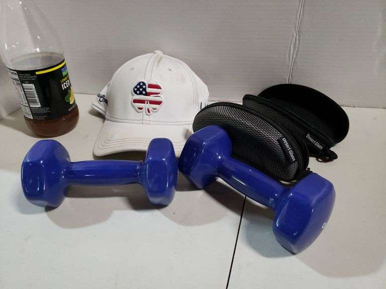 LOT 546 - 5lb Weights, Glass Cases, Hat
