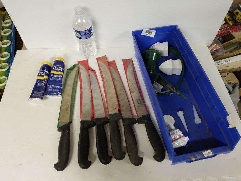 LOT 128 - Narrow Plastic Organizer Containing 2 Vinyl Cement, Six Ling Blade Knives Marked Cannon Cutter And
