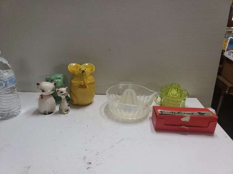 LOT 252 - Vintage glass juicers, Redi-Chef, Salt & Pepper Shakers (cat, mouse, dog)