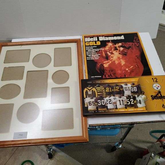 LOT 758 - Misc Items - Picture Frame, Neil Diamond Gold Record & Steelers Battery-operated clock