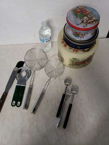 LOT 181 - (3) Decorative Tins, (3) Back Scratchers, And Various Kitchen Utensils