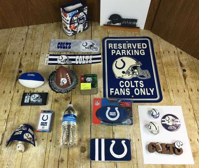 LOT 1008 - Colts Fan Lot 17 pcs: trailer Hitch Cover, Purse, Watch, Wallet, Album, Nightlite, Signs