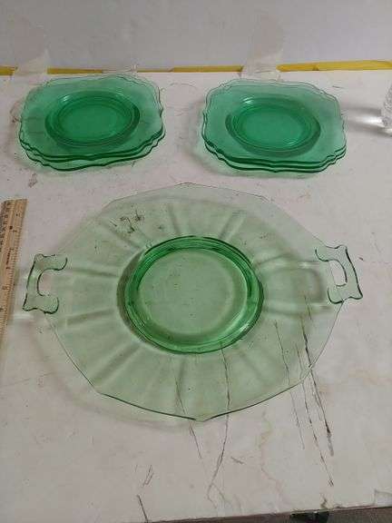 LOT 776 - (6) green tinted Dessert dishes & 10" serving glass dish