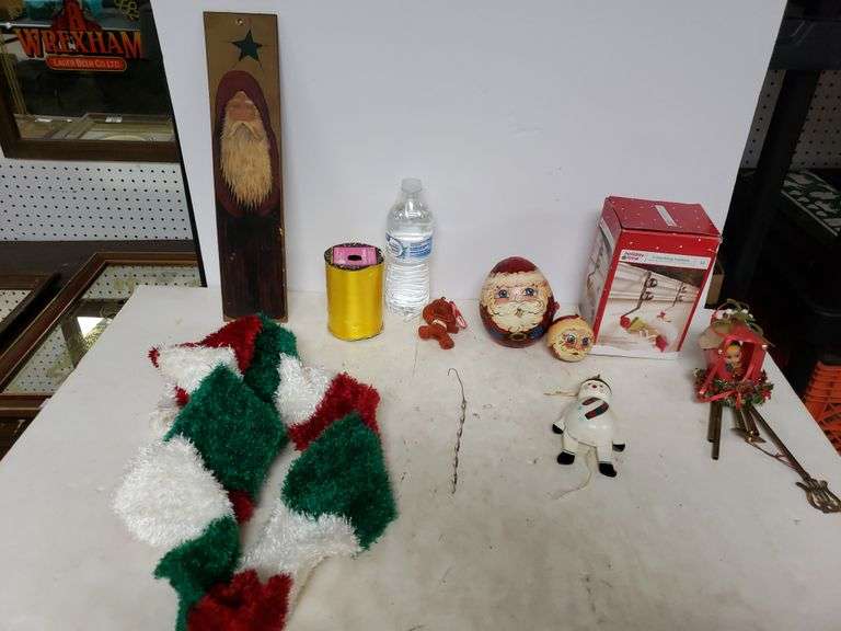 LOT 48 - Christmas Decorations - Jingle Bell Stocking Holders, Elf Wind chimes, Santa Egg, And More