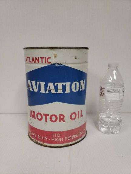 Vintage Atlantic Aviation Motor Oil can with a 5 U.S. quart capacity. Marked SAE 30 on the bottom. Produced by The Atlantic Refining Company, Philadelphia, U.S.A. Promotes protection against rust and corrosion, meeting U.S. Government Spec. MIL-O-2104 for A.P.I. services MS, MM, ML, and DG. Made for heavy-duty, high detergent use. The can shows signs of wear and rust, indicative of its age and previous use, but remains a collectible item.