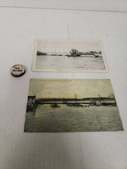 Collection of two vintage postcards depicting the Choptank River and bridges in Denton, MD. The first postcard, in black and white, shows the bridge over the Choptank River, featuring clear architectural details common in early 20th-century construction. The second postcard, presented in color, captures the Dover Bridge across the Choptank River, providing a contrasting scenic view. Both postcards have been postmarked Denton, MD, with visible dates and stamps, indicating their historical authenticity. These postcards are in used condition, showing signs of wear typical for items of this age, such as minor edge wear and faint creases. Ideal for collectors of historical memorabilia, specifically those interested in the architecture and landscapes of Maryland. Each card offers a unique glimpse into the past, with handwritten messages on the back, further enriching their historical value.
