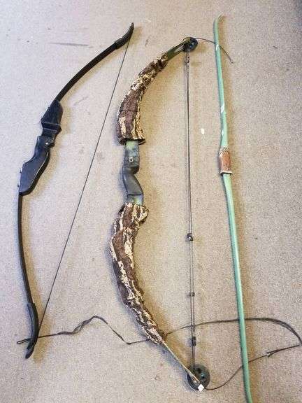 This auction features a lot of three distinct archery bows. Included are a traditional recurve bow, a camouflage compound bow, and a green longbow. The bows show signs of use and wear but no significant damage. All strings are intact. The recurve bow features a black finish, the compound bow has a camo exterior and pulleys, and the longbow is green with a grip wrap. Ideal for collectors, enthusiasts, or archers seeking variety in their equipment.