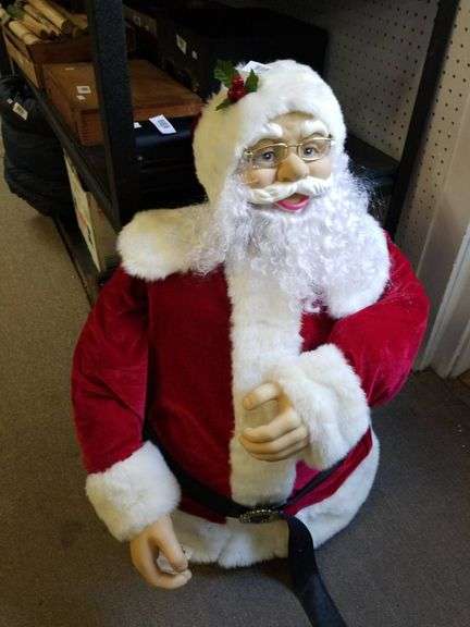 Life-size Santa Claus doll featuring realistic facial details, plush red velvet suit with white faux fur trim, and a matching hat. The Santa figure comes complete with glasses and festive holly ornamentation on his hat. Ideal for holiday decorations, this display piece adds a festive touch to any setting. Made from durable materials, ensuring longevity for seasonal use. Measures approximately the height of a standard water bottle for scale, making it a perfect fit for indoor seasonal setup.