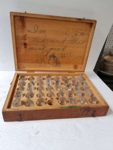 A vintage wooden storage box designed to hold eyeglass lenses. The box features individual compartments for organizing various lenses, with numbers handwritten above each slot. The interior lid is adorned with sketches and writing, adding a unique, personalized touch. Two metal clasps secure the lid. The exterior shows minor wear consistent with age, indicating prior use. Made of wood, the box is sturdy and practical for collectors or optometry enthusiasts.