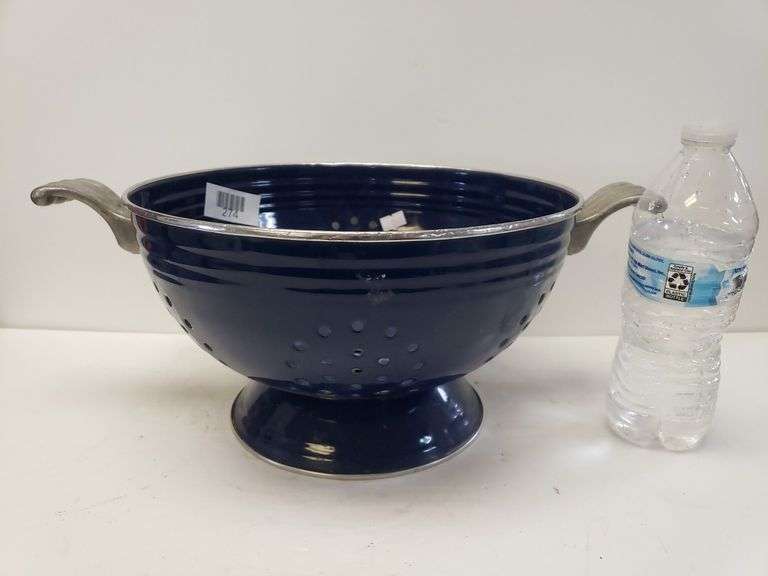 Genuine Fiesta colander, made for Metro Marketing, authorized by The Homer Laughlin China Co. Crafted in Thailand, this blue colander features durable construction with metal handles. It provides practicality and vintage appeal, perfect for kitchen use or display. The colander shows wear typical from usage, adding to its character. Ideal for collectors of kitchenware or Fiesta enthusiasts, offering nostalgia and utility.