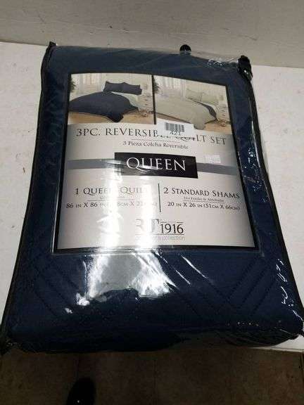 The 3-piece reversible quilt set includes one queen-sized quilt and two standard shams. The quilt measures 86 inches by 86 inches (218 cm x 218 cm), while the shams measure 20 inches by 26 inches (51 cm x 66 cm). It offers a reversible design, providing two different looks in one set. The quilt and shams are crafted for durability and comfort. RJ 1916 exclusively designs this set, ensuring high quality and style. Ideal for enhancing any bedroom decor with its versatile and stylish appearance. New and packaged for protection.