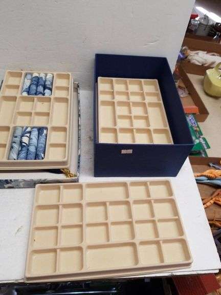 Fabric-covered drawer organizer with a floral-patterned lid and blue base. Includes beige compartmentalized trays, ideal for organizing small items. Lid features a floral fabric design, and the trays fit snugly inside the box. Sturdy construction for storage purposes. Trays are removable, allowing flexibility in arrangement. Condition shows no obvious damage, some wear consistent with previous use. Dimensions not specified, water bottle shown for scale.