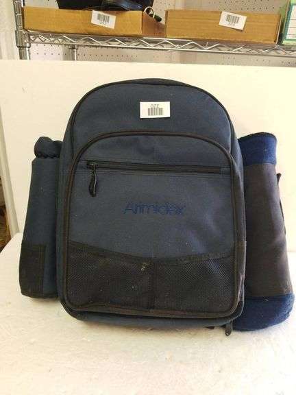 Blue picnic backpack set with compartments and accessories. The backpack includes a zippered front pocket, shoulder straps, and side compartments for items such as blankets or bottles. Inside is a complete set of utensils with red handles including spoons, forks, knives, a bottle opener, a cutting board, cloth napkins with a colorful design, and four white plates with red trim. Suitable for a small picnic gathering. The overall condition reflects minor signs of use.