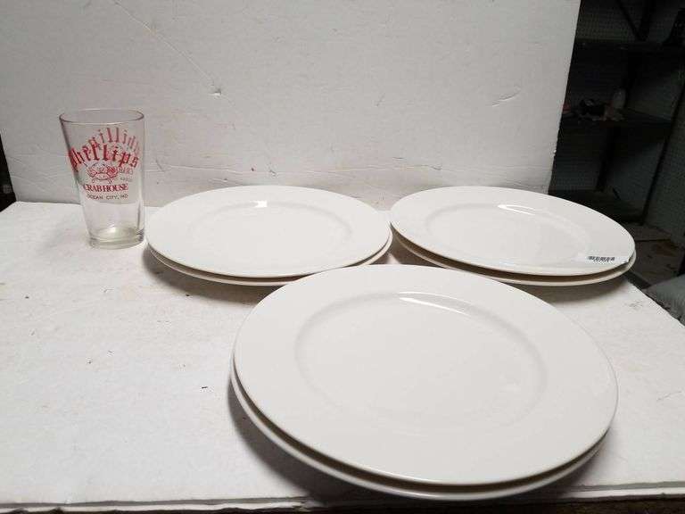 Set includes four white porcelain plates from Pier 1's New Essentials Classic collection, dishwasher and microwave safe, made in China. Also includes one clear glass tumbler from Phillips Crab House, Ocean City, MD, with red logo detail. Plates and glass are in pre-owned condition, with no visible cracks or chips.