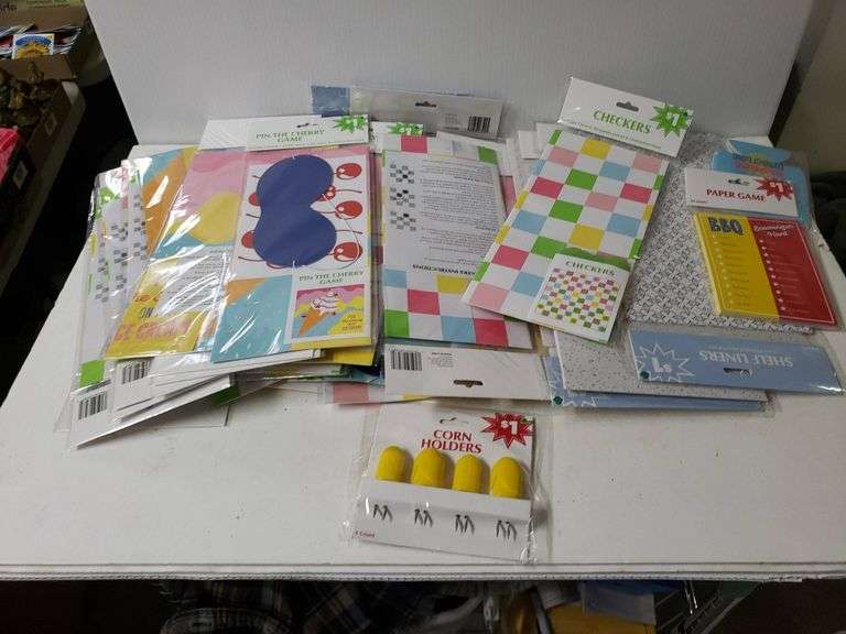 Bundle of assorted craft and game supplies. Includes unopened packages of checkered crafting sheets, decorative paper sheets, a pin-the-tail-on-the-donkey party game, coin holders, and other colorful decorative items. All items are new and sealed in original packaging.