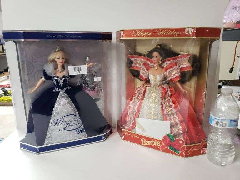 Two collector's edition Barbie dolls in original packaging. The Millennium Princess Barbie doll, from the Special Millennium Edition by Mattel, features a navy and silver gown, tiara, and crystal ornament accessory. The Happy Holidays Barbie doll, also by Mattel, wears a festive red, white, and gold gown with matching accessories. Both dolls come in their original boxes. The Millennium Princess box shows minor wear, while the Happy Holidays box has visible wear on one corner, with slight peeling. Dolls themselves appear undisturbed and in excellent condition. Great for collectors.