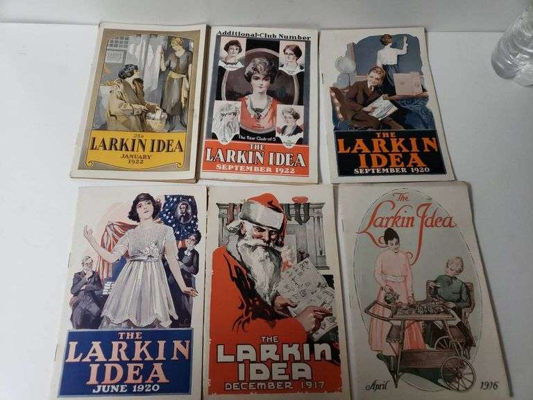 Set of six 'The Larkin Idea' magazines, including issues dated April 1916, December 1917, June 1920, September 1920, January 1922, and September 1922. These publications feature vivid, period-specific illustrations and advertisements from the Larkin Company, a notable mail-order business of the early 20th century. The magazines appear to focus on household goods, fashion, and business-related content. Some covers display seasonal or patriotic themes, and their style reflects the advertising trends of the era. Condition details include potential age-related wear such as minor tears, foxing, or creases; otherwise, they appear well preserved for their age. Ideal collector's item for those interested in vintage advertising, ephemera, or 20th-century retail history.
