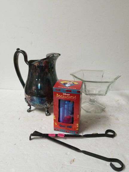 Mixed lot of items including a metal pitcher with footed base featuring a tarnished patina, a clear glass pedestal bowl with hexagonal shape, a Disney Pocahontas-themed decorative candle in original box, and two black metal hooks with looped ends. The pitcher shows signs of tarnish and wear. The glass bowl is free of visible chips or cracks. Pocahontas candle packaging is intact. Hooks have minimal wear.