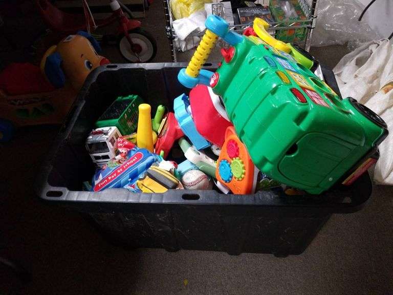 Large bin containing assorted children's toys, including a green toy recycling truck with activity features, a toy microwave, a baseball, plastic bowling pins, and various other colorful play items. Toys are made of plastic and other materials, intended for interactive and educational play. The bin itself is black, durable, and included with the lot. Items show wear from previous use but appear functional for play. Ideal for young children or donation purposes.