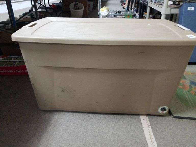 Beige plastic storage container with a secure-fitting lid, suitable for general storage purposes. It features a durable plastic construction with built-in side handles for easy transportation. The interior is spacious, capable of holding various items, and shows wear consistent with use. The exterior has visible scuff marks and minor surface imperfections. Ideal for garage, basement, or general household storage.