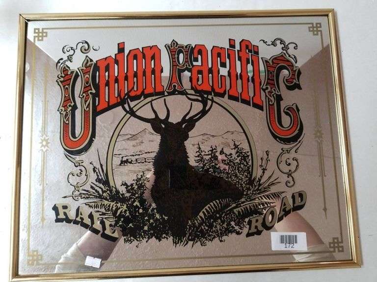 Vintage Union Pacific Railroad-themed decorative mirror featuring an artistic depiction of a tree and train-related imagery. The mirror includes ornate detailing around the border and text at the center. It is set within a gold-tone frame with hanging hardware on the back. Condition appears good with minor wear on the backing. Exact dimensions are not specified.