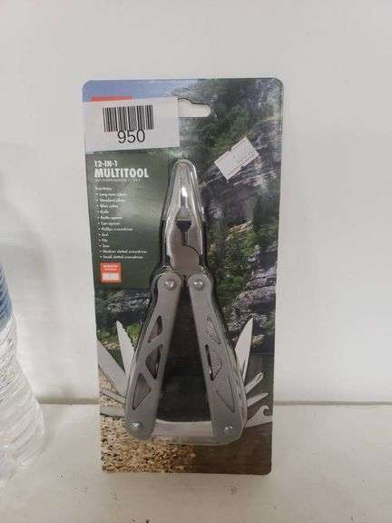 Ozark Trail 12-in-1 multitool featuring stainless steel construction. Includes essential tools like pliers, knife, saw blade, screwdrivers, and more. Comes in original packaging with storage case. Packaging indicates tools are designed for outdoor and everyday tasks. Package is sealed and in new condition.