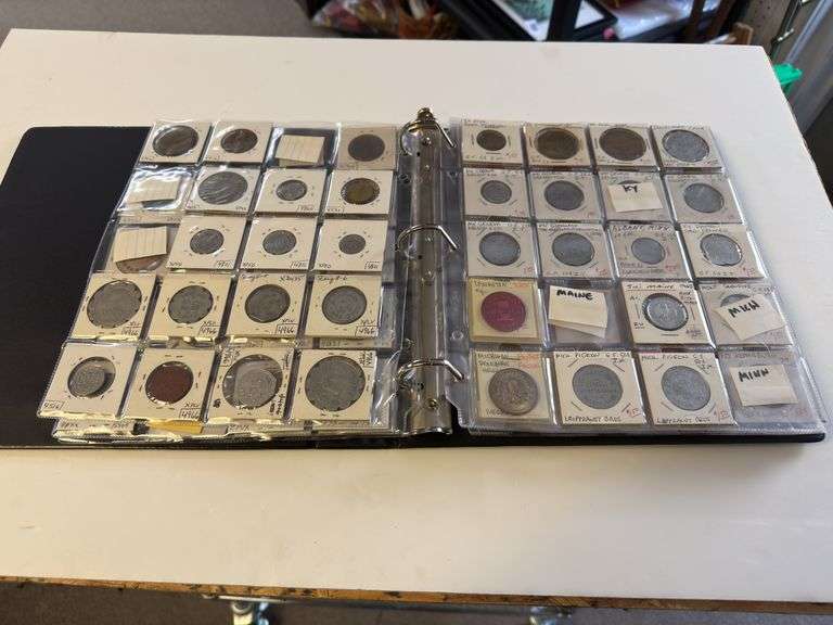 Binder album containing a collection of world coins, each housed in individual labeled coin holders and secured within plastic pages. The coins are from various countries, denominations, and years. The binder is labeled ‘Token by State Book #1' on the cover and includes organized pages designed for coin storage. Specific details about the rarity, origin, or composition of the coins are not provided.