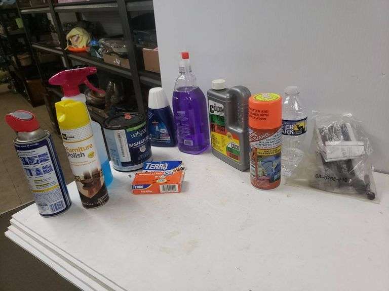 Assorted lot of cleaning and maintenance supplies, including furniture polish spray, Valspar Signature paint, Terro ant killer (two unopened boxes), Calcium/Lime/Rust cleaner, general-purpose cleaner, purple liquid cleaner, silicone water guard, and other related items. Most containers are opened, with some contents used. Items are in varying conditions due to use and storage.