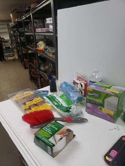 Lot of assorted cleaning supplies including a Swiffer Sweeper refill pack (32 sheets), Kill-A-Mite laundry additive, two packs of Purdy roller covers (size XL, compatible with 1/2-inch to 3/4-inch rollers), brushes, green masking tape, lint roller, Scotch-Brite sponge, a roll of plastic wrap, a pack of dust rags, and a Deer Park water bottle. Items vary in packaging status and condition.