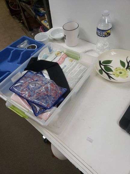 A mixed lot consisting of a blue plastic organizer tray with compartments, a white ceramic plate with a floral design, a plastic bin containing various items such as an ice or heat gel pack, documents, and a black fabric strap. Additional items include two small bowls, a white ceramic mug with 'CAT' printed on it, and a plastic water bottle (Deer Park brand). The condition of the items varies, with visible signs of use on some pieces.