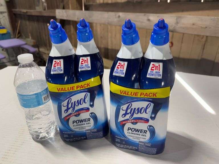 Lysol Power Clinging Gel Toilet Bowl Cleaner in a 2-pack value set. Each bottle contains 24 oz (709 mL) of gel cleaner formulated to eliminate tough stains, kill 99.9% of viruses and bacteria, and destroy toilet bowl rings. Features an Atlantic Fresh scent and a thick formula that clings to surfaces for enhanced cleaning. The bottle includes a precision angled nozzle for targeted application. For use on toilet bowls only. Pack includes two bottles with clear usage instructions and safety guidelines on the packaging.