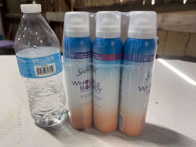 Sealed pack of 3 Secret Whole Body Deodorant sprays, each with a Peach & Vanilla Blossom scent. Clinically proven odor protection, aluminum-free formula, and dermatologist-tested. Size and weight of each bottle are unspecified. The packaging is intact and in excellent condition.