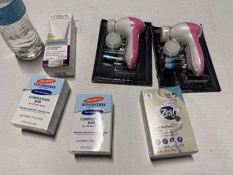 Skin and beauty care bundle includes two unopened Palmer's Skin Success Complexion Bars (3.5 oz each), one box of Zest Cocoa Butter & Shea Butter Soap Bars (two 4 oz bars), one L'Oréal Wrinkle Expert 55+ Age Defense Face Lotion (1.7 fl oz), and two electronic facial cleansing brushes, each with one replacement brush head and two AA batteries included. All items are in new condition.