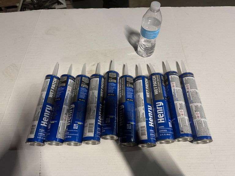 Lot of 10 tubes of Henry Wet Patch Roof Leak Repair Sealant. Each tube contains 10.1 fl oz (298 mL) of black waterproof sealant, ideal for roof leak repairs. The product is designed for wet and dry surfaces. Factory-sealed and unused, with safety and usage instructions indicated on the packaging.