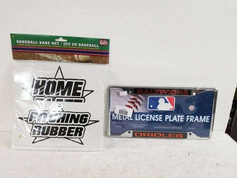 Lot includes a packaged baseball base set and a Baltimore Orioles metal license plate frame. The baseball base set contains home plate, three bases, and a pitching rubber, constructed from durable material intended for recreational use. The Baltimore Orioles metal license plate frame features the MLB logo and team branding, showcasing 'Baltimore Orioles' lettering in bold. Both items are new and unused.