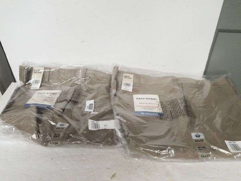 Two pairs of Dockers Easy Khaki pants in a Big & Tall Classic Fit. Each pair features a comfort waistband, no wrinkles, and stretch for performance, as indicated on the packaging. The size for both pairs is 44x29. Original retail price is marked at $50 per pair. Items are new in original packaging.