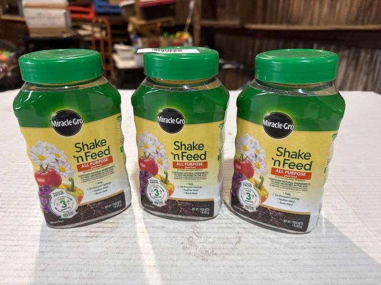 Set of 3 bottles of Miracle-Gro Shake 'n Feed All Purpose Plant Food, 1 lb each. Provides nutrients for up to 3 months. Includes natural ingredients such as kelp, earthworm castings, feather meal, and bone meal. For use in-ground and in containers.