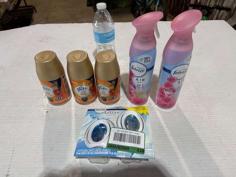Includes 3 Glade Hawaiian Breeze spray refills (6.2 oz each), 2 Febreze Air Mist bottles (8.8 oz each), and 1 Febreze Small Spaces pack (linen & sky scent).