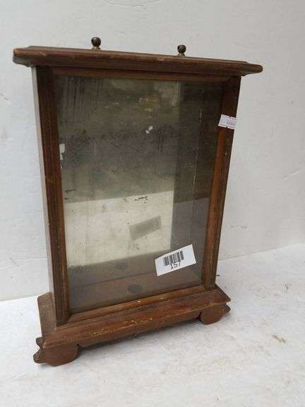 Antique wooden display case featuring a glass front. The case is upright with a flat top and decorative trim. Constructed from wood, it shows signs of wear consistent with age, such as scratches and fading. Glass front panel is clear but may have marks. Includes decorative ball-shaped knobs on top. Suitable for displaying various small items or collectibles. Classic design for a timeless look, ideal for antique enthusiasts or collectors seeking to showcase items securely.