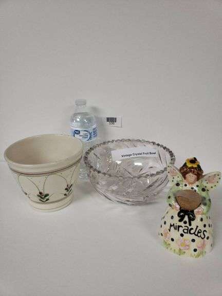Lot of 3 items including a vintage cut crystal fruit bowl with intricate star and geometric patterns, a ceramic flower pot with hand-painted floral decoration and patina on its base, and a 'Miracles' angel-themed bank constructed of ceramic with a cork lid and decorative floral design, marked 'Pennies from Heaven'.