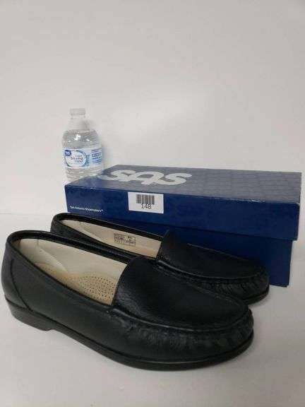 Pair of SAS Women's Simplify loafers in black, size 8.5 medium width. Features a leather upper, cushioned interior, and a slip-on design for comfort. Made in the USA, comes with the original box labeled 'Simplify Pearl Bone.' Outsole marked with the SAS branding and 'Tripad Comfort.' Ideal for casual or professional wear.