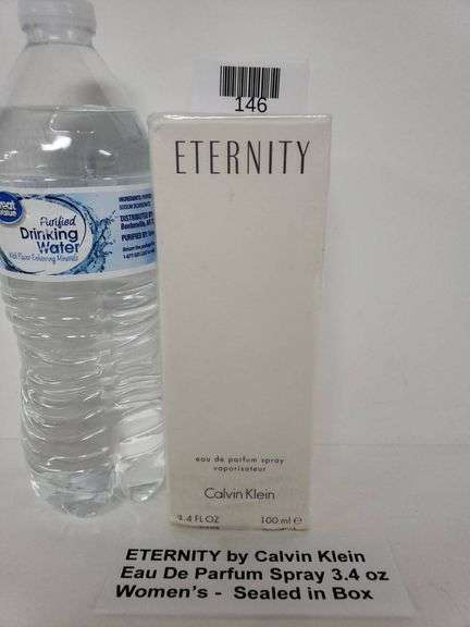 New in sealed box, Calvin Klein Eternity Eau De Parfum Spray for women, 3.4 oz (100 ml). The product is in its original packaging and features ingredients such as alcohol denat, fragrance, parfum, and benzophenone. Box includes details like safety directions to keep away from heat or flames.